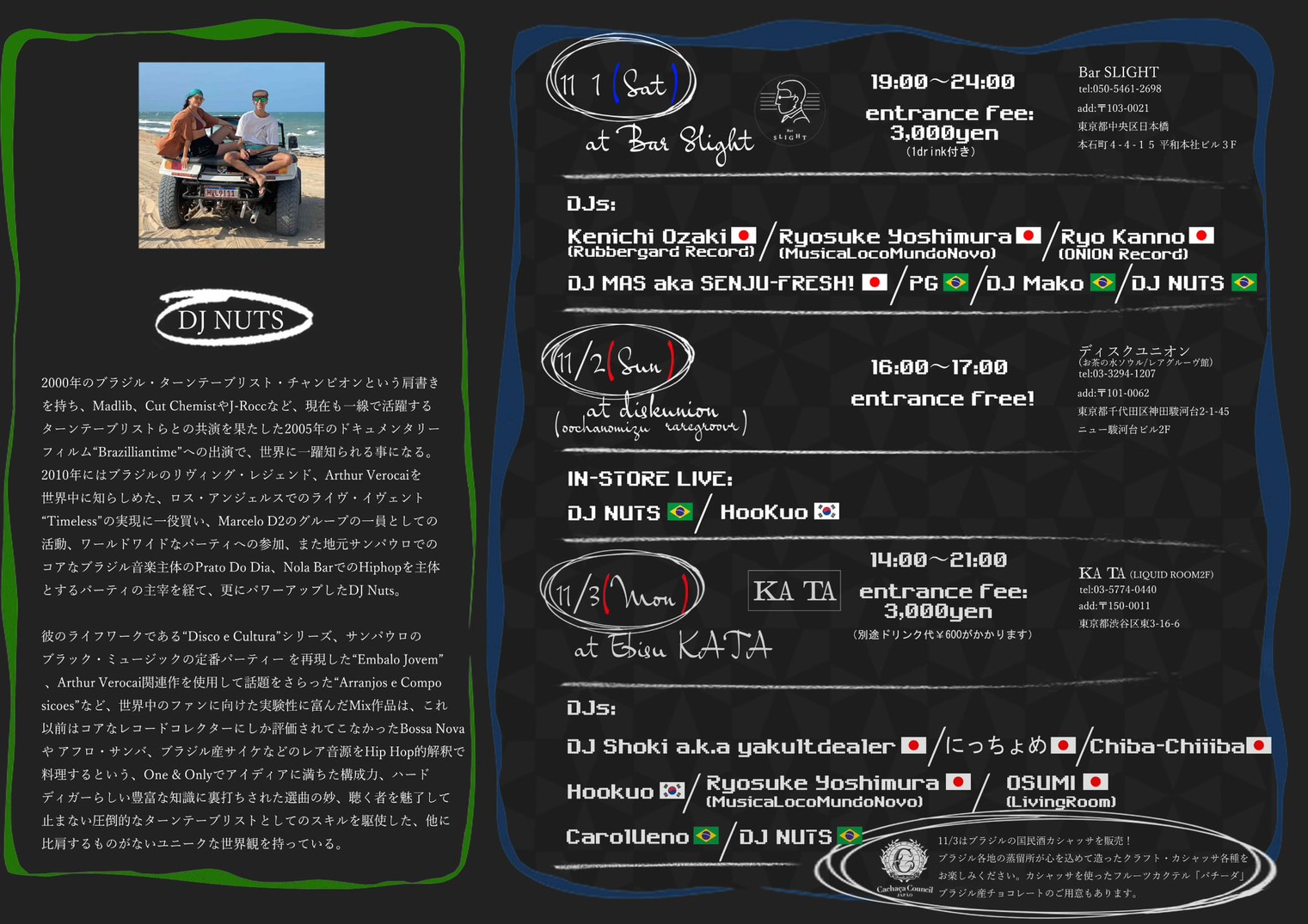 2010年にはブラジルのリヴィング・レジェンド、Arthur Verocaiを世界中に知らしめた、ロス・アンジェルスでのライヴ・イヴェント”Timeless”の実現に一役買い、Marceo D2のグループの一員としての活動、ワールドワイドなバーティへの参加、また地元サンパウロでのコアなブラジル音楽主体のPrato Do Dia、Nola BarでのHiphopを主体とするパーティーの主宰を経て、更にパワーアップしたDJ Nuts。